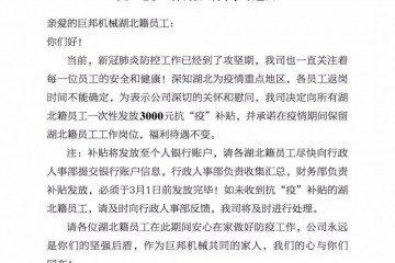 27日上午,巨邦機械發布關于發放湖北籍員工一次性3000元抗“疫”補貼及保崗的通知,一度被網友們評為“有情有義”的良心企業。為有情有義的巨邦機械,點贊!!!