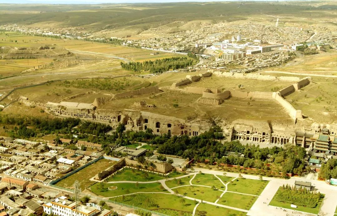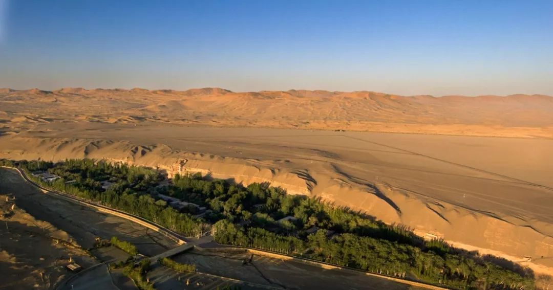 ▲ 莫高窟全景。植物繁茂處是以前的大泉河河谷,莫高窟在其后的崖壁處(方位上是河谷西側)。遠處是鳴沙山,樂僔和尚就是站在那里望見了對面三危山上的金光(傍晚時分,東邊卻出現金光)。莫高窟坐西朝東,正對著三危山。攝影/吳健