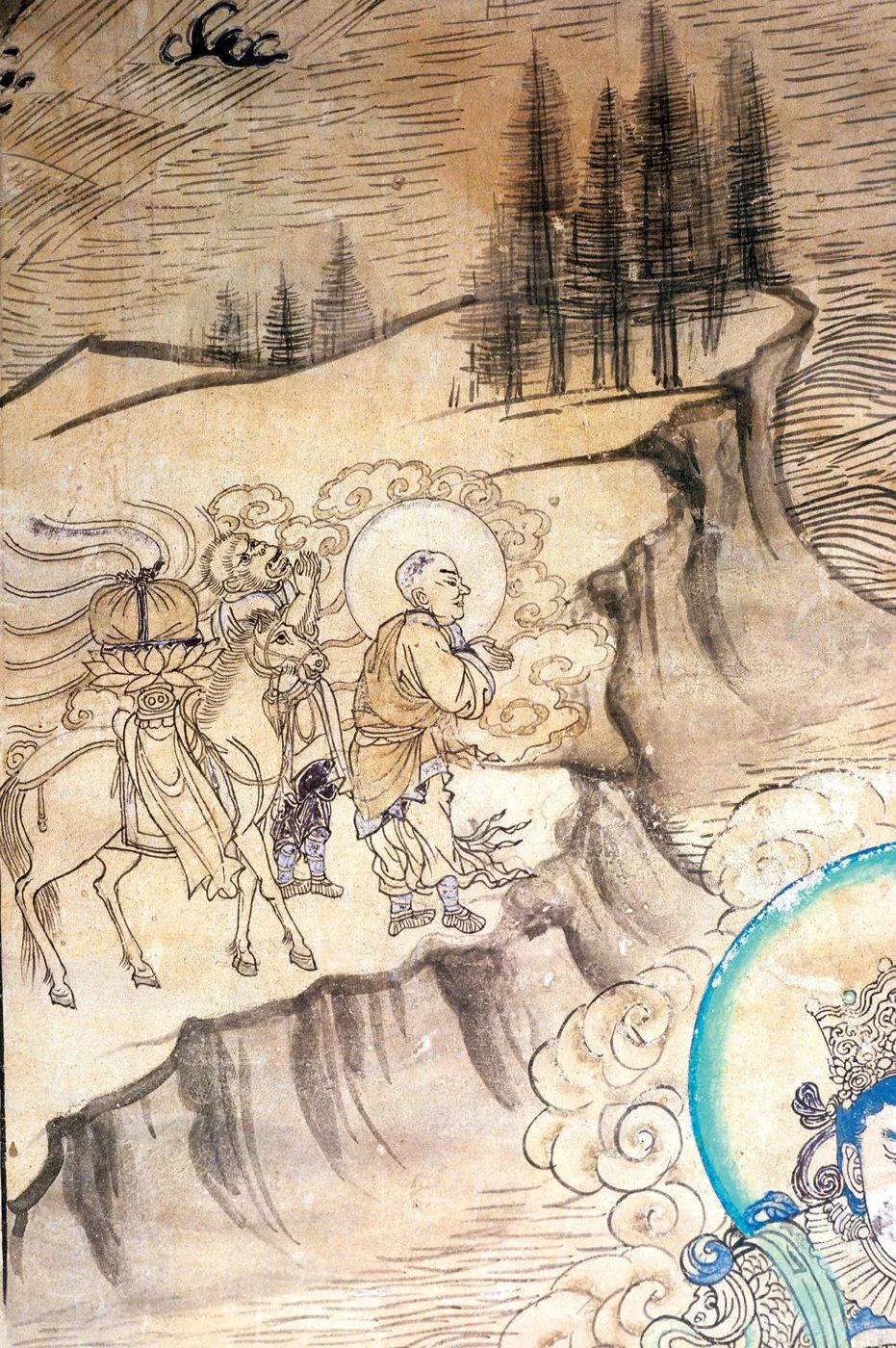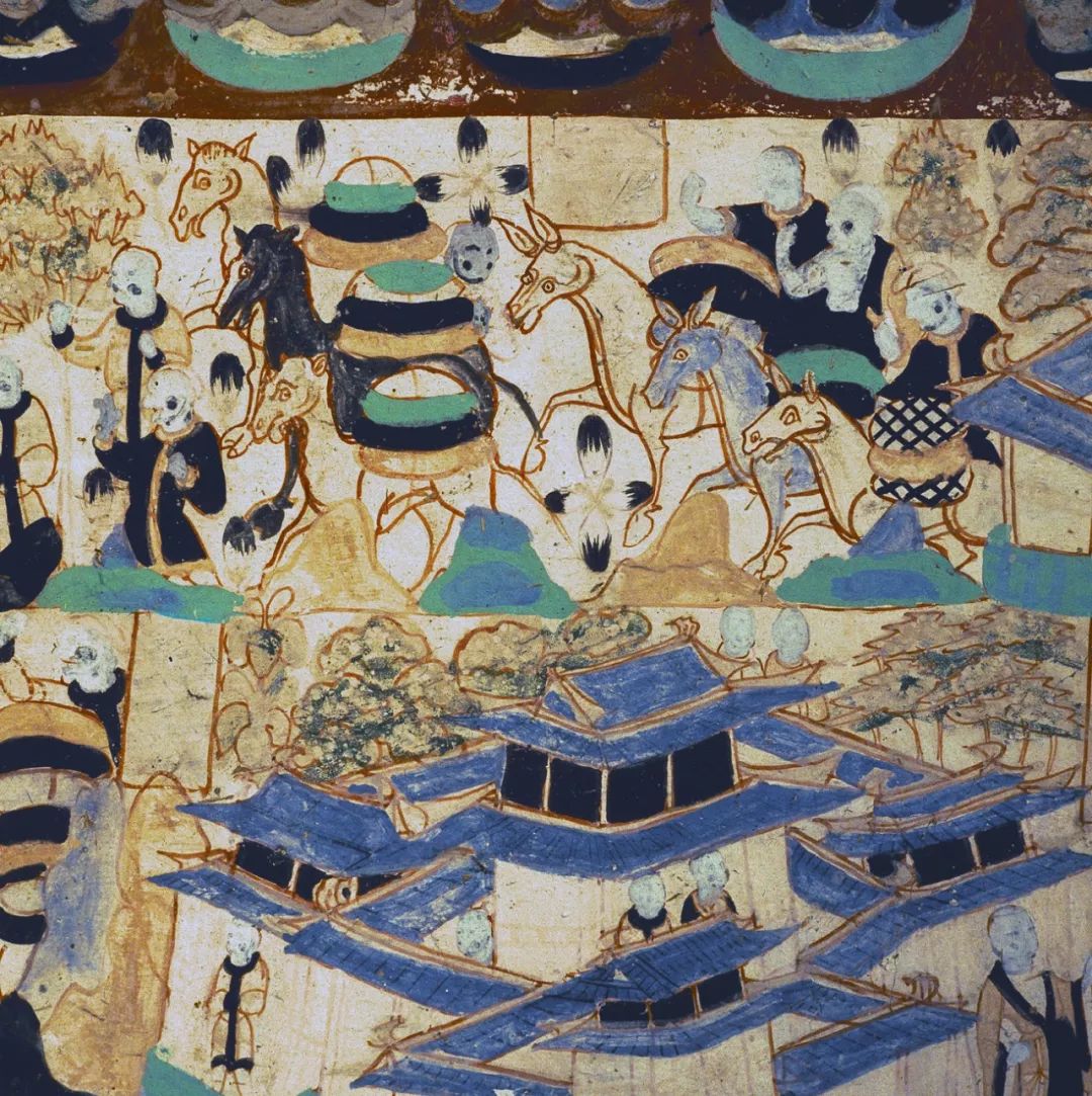 ▲ 莫高窟姊妹窟(榆林窟)中的“西游記”(白馬馱經;西夏)。這種繪畫手法更重線條,與前者不同。攝影/吳健