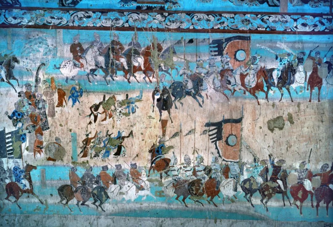▲ 莫高窟296窟福田經變中的商隊(北周)。右下角的人物穿著對襟式衣服,流露出漢化痕跡。從中也可看出當時的建筑風貌。北周時期的人物也有民族特色。攝影/茹遂初