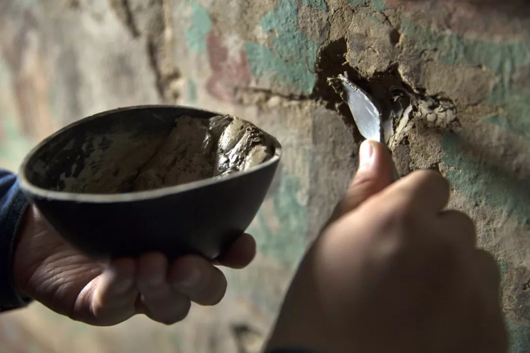 ▲ 敦煌壁畫的修補,可以看出其中泥的使用。攝影/孫志軍