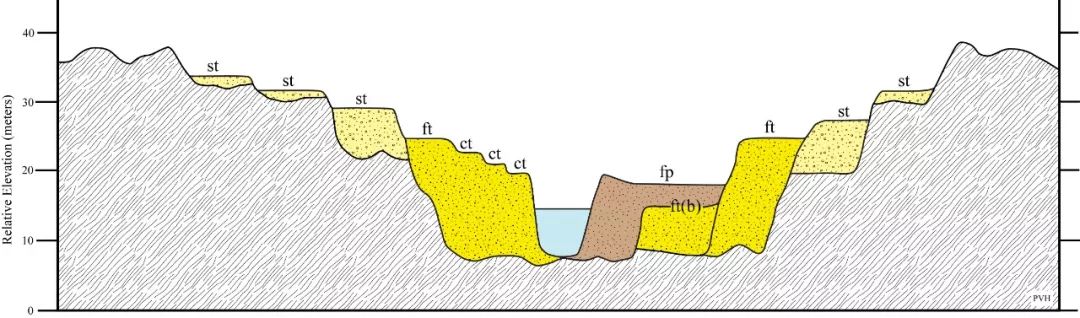 ▲ 地殼抬升時,原來的河谷底部會被整體抬上來,而河流下切,就會在外圍出現不再被水淹沒的部分,形成臺階狀的“階地”。一般而言,有幾級階地,地殼就抬升了幾次。階地面相對平坦,階地陡坎相對豎直。圖/wikipedia, Cristellaria