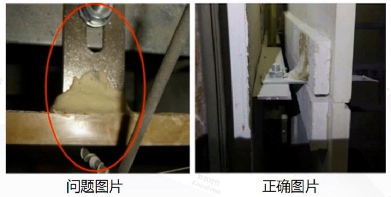 問題分析:預(yù)埋件固定位置離墻角過近,膨脹螺栓直接打在墻體抹灰層上導(dǎo)致墻角破壞。