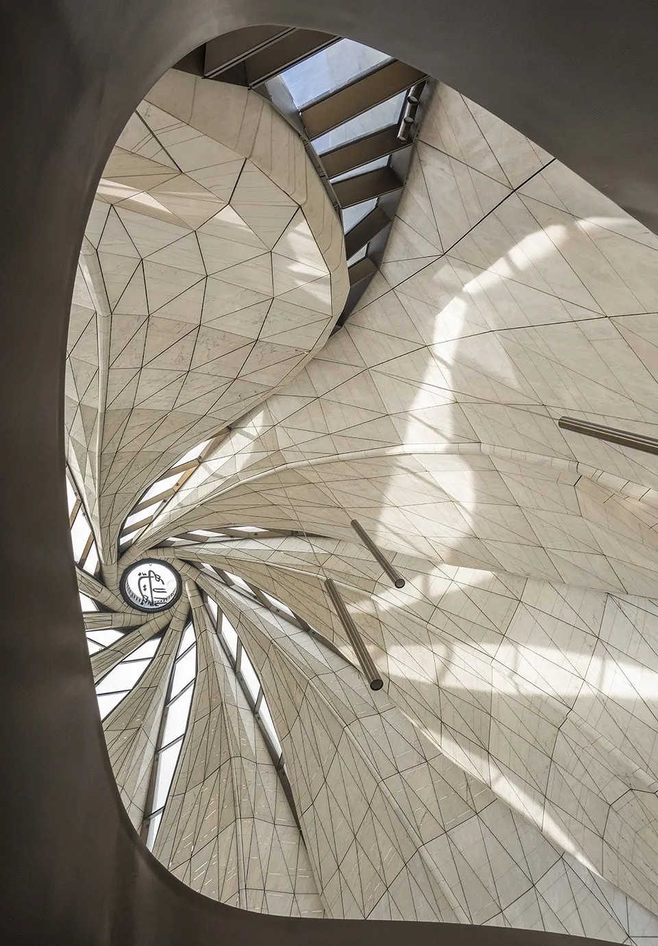 在結構上,巴哈伊寺廟展現出作為“人”的場所的一種普世的吸引力。九個造型獨特的“翅膀”以扭轉的姿態形成優雅的聚合,最終交匯于頂部的窗洞,與地面相連的中央空間周圍營造出一種輕盈的律動。這一結構外側的材料,選用的是1129片經過四年測試和實驗而來的鑄造玻璃面板,而內部營造出潔白溫潤質感的半透明大理石,則來自于葡萄牙。