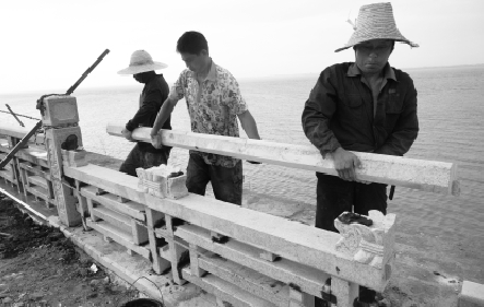 石攔板搬運時必須使每條繩子同時受力,并仔細校核石料的受力位置后慢慢就位,將挑出部位放于臨時支撐上。 將石攔板輕抬對準立柱榫槽就位。 石攔板安裝就位后仔細與控制線進行校核,若有位移,應點撬歸位,將構件調整至正確位置。