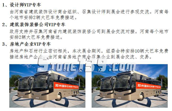 應政府要求,組委會決定于9月3-5日展會期間,派遣大巴車到鄭州市、開封市、平頂山市、洛陽市、商丘市、安陽市、新鄉市、許昌市、鶴壁市、焦作市、濮陽市、漯河市、三門峽市、周口市、駐馬店市、南陽市、信陽市、濟源市等河南18個地市,免費迎接設計師、房地產企業、建筑裝飾裝修公司、風景園林機構等石材直接使用方到展會與石材企業一對一交流對接。