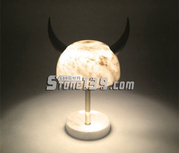 打磨成空心半球形的阿菲永白大理石燈罩上嵌著兩個金屬牛角,這款大理石創意臺燈靈感來源于納維亞戰士的盔甲。關燈時用一派優雅恬靜詮釋曾經的野蠻,開燈時狠厲的牛角隱匿在黑暗中獨留一顆發光的未知“星球”。