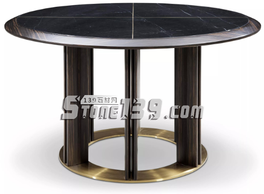 這款餐臺寓意為圓融、團(tuán)圓之意,上下兩個(gè)圓形,上實(shí)下虛,形成鮮明對比,大理石層面嵌入到黑檀木臺面里,邊緣斜切,打磨圓潤,消減厚重之感,桌腳富有氣勢,腿中間處稍留鏤空,使得穩(wěn)重之余不顯笨重,底盤采用鏤空銅件,輕奢優(yōu)雅,提亮產(chǎn)品色調(diào)。