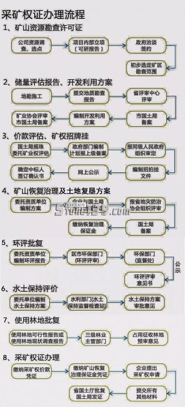 采礦權證辦理流程見下圖,要按照流程做各項技術方案和審批,各方案又是一環套一環,地質儲量報告做完才能做開發利用方案,開發利用方案評審備案后,才能進行價款評估,然后才上網掛牌出讓,在這之前,采礦權人都是不確定的。