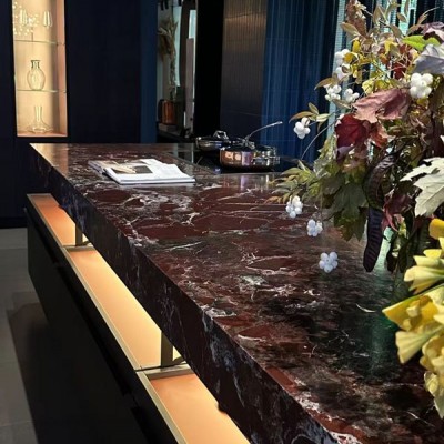 一、天然材質的 “藝術孤品” 屬性 紫羅紅大理石的 深紅底色 + 白色脈絡 是天然形成的 “潑墨畫”: 紋理 獨一無二(每塊石材的白紋走向、疏密都不同),自帶 “高定孤品” 的稀缺感; 表面 高光質感 如鏡面,折射光線時,白紋會隨角度變化呈現 “流動感”,仿佛將地質運動的韻律凝固在臺面。 二、色彩與氛圍的 “沖突平衡術” 紅與黑 / 藍的底色呼應: 大理石深紅底色,與背景深色柜體(深藍、黑色)形成 同色系層次對比(深紅更鮮艷,柜體更暗沉),既統一調性,又避免單調。 白紋與花藝的細節呼應: 石材中的白色脈絡,與花藝里的 白色漿果、淺色葉片 形成視覺串聯,讓 “硬” 的石材和 “柔” 的植物產生對話,中和了大理石的厚重感。 三、燈光設計的 “點睛魔法” 島臺下方的 嵌入式暖光(琥珀色) 是關鍵: 懸浮感營造:從底部照亮石材邊緣,讓厚重的大理石臺面 “懸浮” 起來,削弱物理重量感; 紋理強化:暖光打亮石材底部,使白紋的立體感更突出,宛如給紋理 “加了高光”; 氛圍升溫:暖光中和了深紅的冷冽,讓空間多了份 溫潤的奢華感(區別于冷光的 “距離感”)。 四、功能與藝術的 “雙重敘事” 社交核心的 “視覺錨點”: 島臺是廚房 / 客廳的社交中心,紫羅紅大理石以 強烈的視覺沖擊 成為空間 “C 位”,擺放書籍、花藝后,從 “操作臺面” 升級為 藝術展示臺,承載交流、打卡、審美體驗等多重功能。 “剛柔并濟” 的氣質適配: 大理石的 硬朗質感(天然石材的剛性),與周圍玻璃柜(通透)、布藝窗簾(柔軟)、金屬器具(精致)搭配,形成 材質混搭的平衡美學,讓空間既有 “高端氣場”,又不失生活溫度。 這種設計將紫羅紅大理石的 天然藝術感 與 空間需求 深度融合:既利用它的 “吸睛力” 打造焦點,又通過色彩、燈光、搭配弱化其 “厚重感”,最終實現 “奢華不壓抑,實用又藝術” 的高階美學表達。
